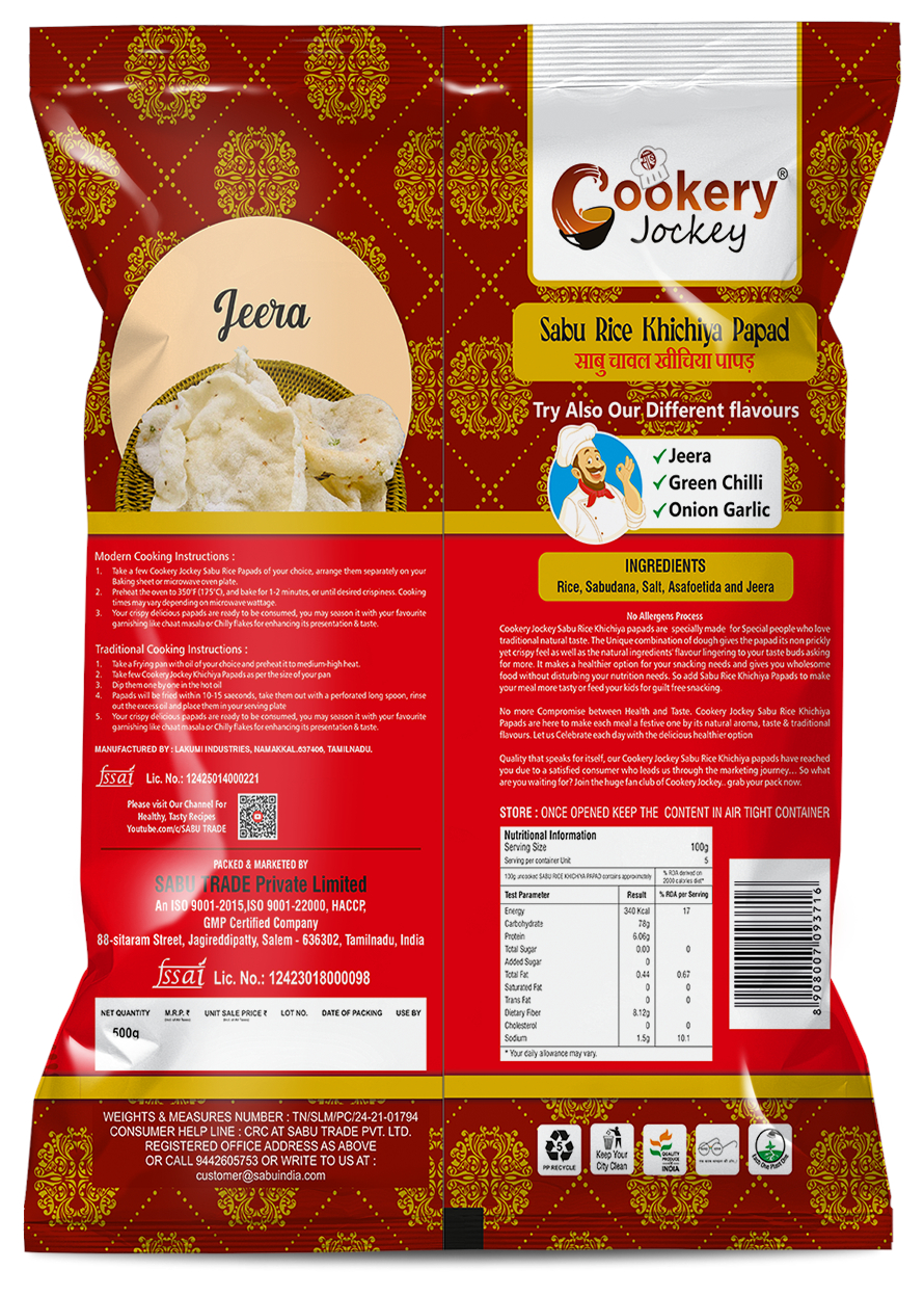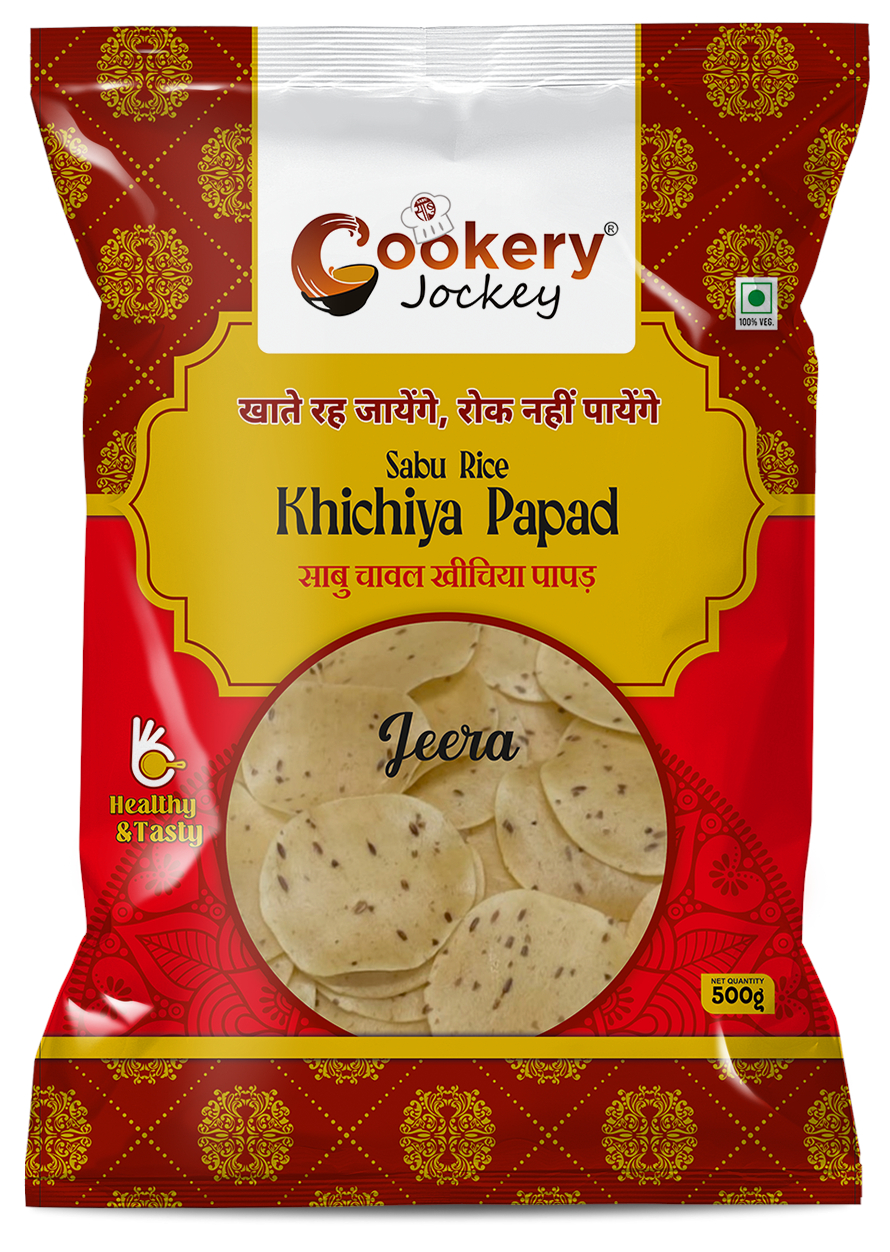 Cookery Jockey Sabu Rice Khichiya Jeera papads are specially made for Special people who love Traditanal natural taste. The Unique combination of dough gives the papad its non prickly yet crispy feel as well as the natural ingredients flavour lingering to your taste buds asking for more. It makes a healthier option for your snacking needs and gives you wholesome food without disturbing your nutrition needs. So add Sabu Rice Khichiya Papads to make your meal more tasty or feed your kids for guilt free snacking. The unique combinational of Deep fry the Papadums for the crispiest results found in the Image, Yummy and Crunchy Papadums Ready to Fry.